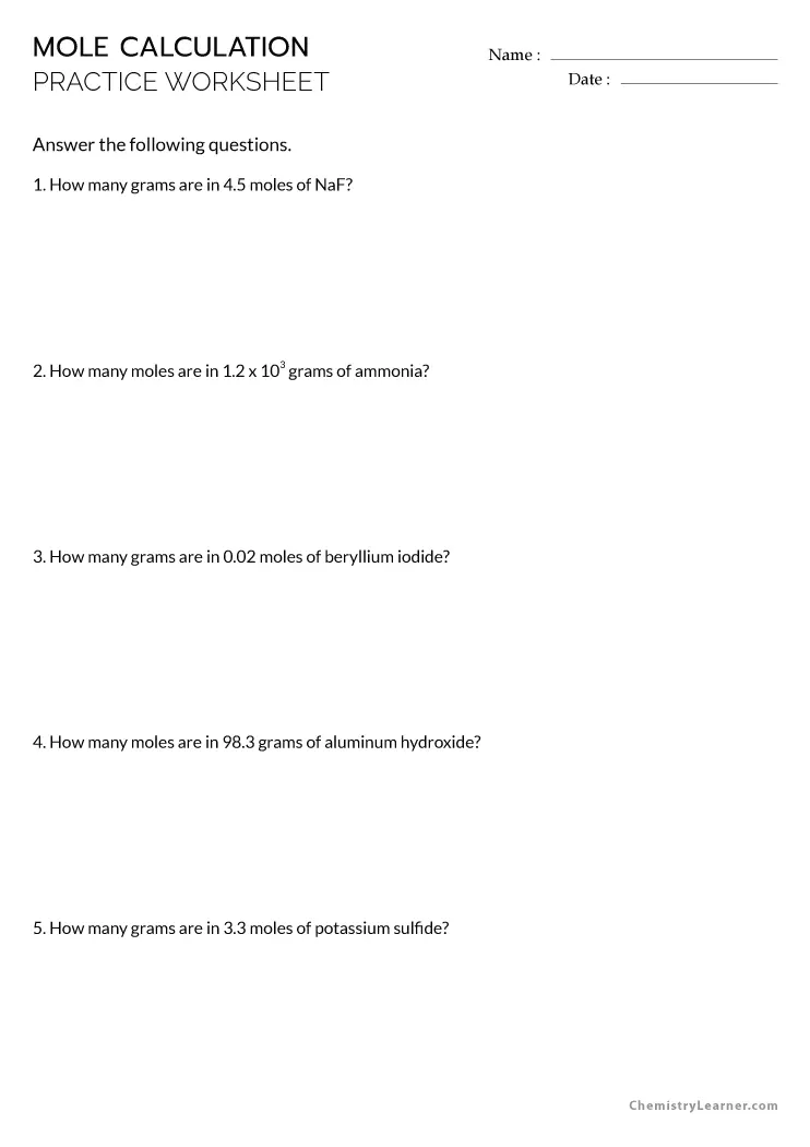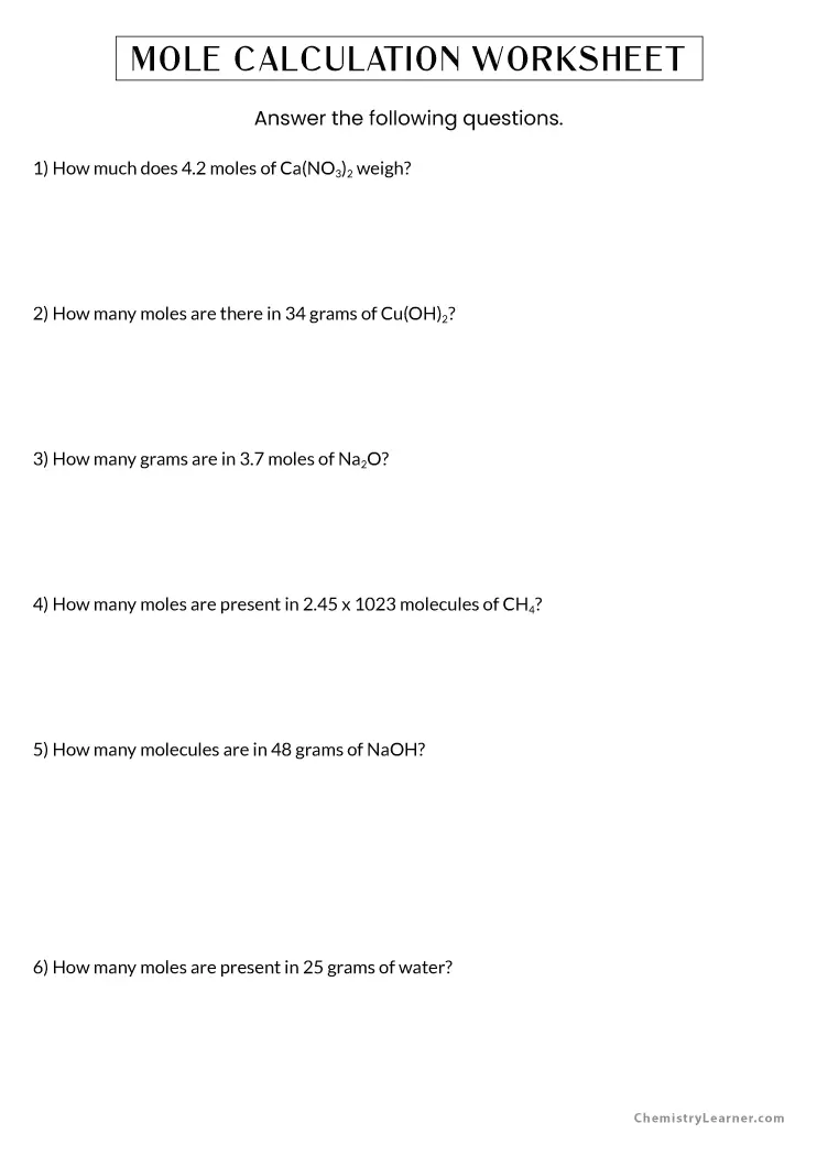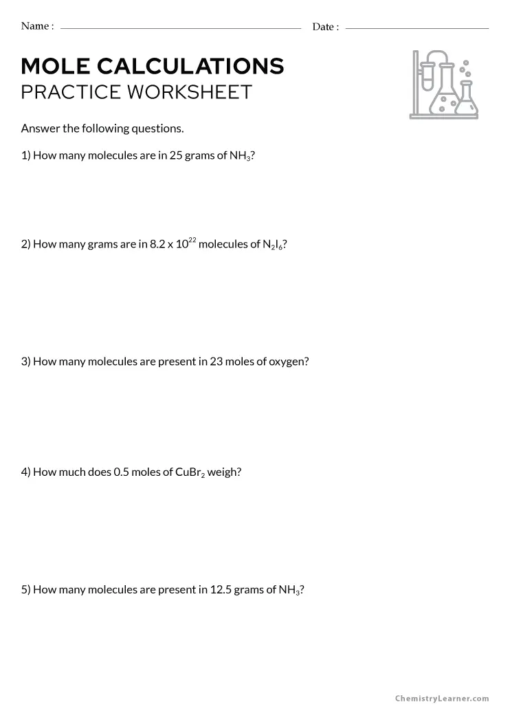 These worksheets are used to check a student’s capability of using the concept of the mole in numerical problems.